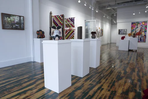 This site - specific fiber installation is hung from a house-shaped frame and can be lowered or raised using a pulley. This method was used historically to store quilts. The textiles are two sided; colorful on the exterior and plain with hand stitching on the interior. Conceptually, this work analyzes the differences between public and private spaces in relation to our homes.